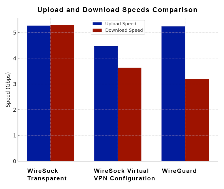 As illustrated in the above charts, the WireSock Secure Connect showcases notably higher download speeds compared to the official kernel mode implementation of Wireguard for Windows, and undoubtedly surpasses all other tested implementations.